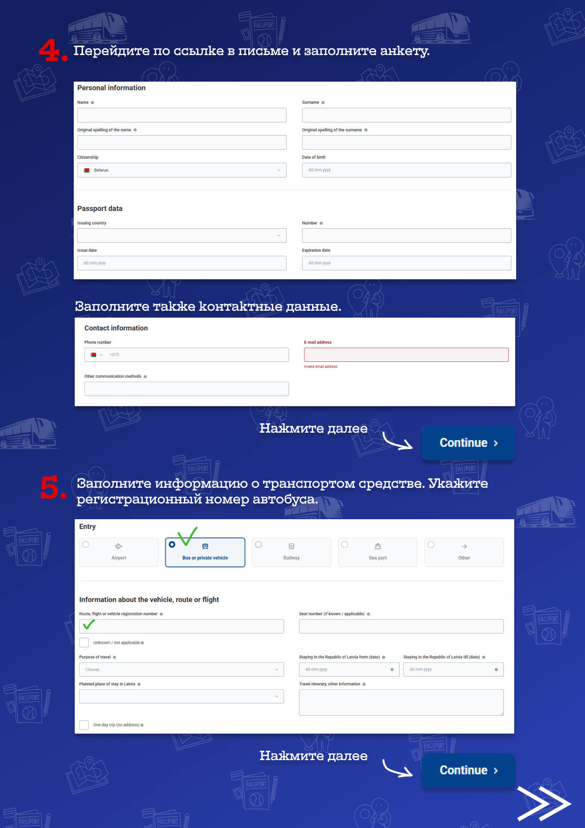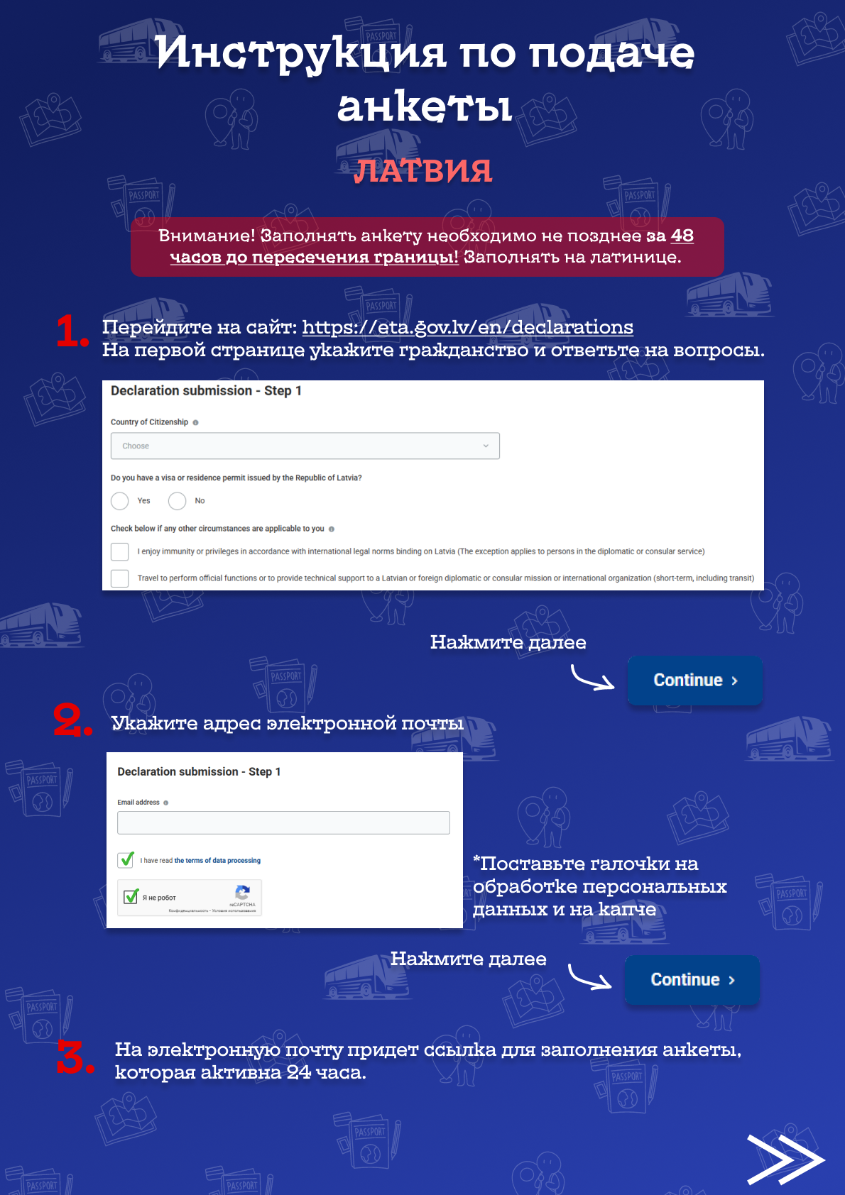 🕒 Обратите внимание: анкету необходимо подать не позднее чем за 48 часов до пересечения границы. Это обязательное требование латвийской стороны.