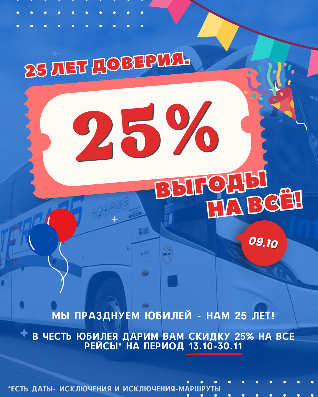 🥳 25 лет пролетели незаметно. Спасибо, что вы с нами! В честь нашего праздника дарим вам нашу пламенную благодарность — скидку 25% на все рейсы* партнера-перевозчика Байертранс на период поездок 13.10-30.11❤️🔥