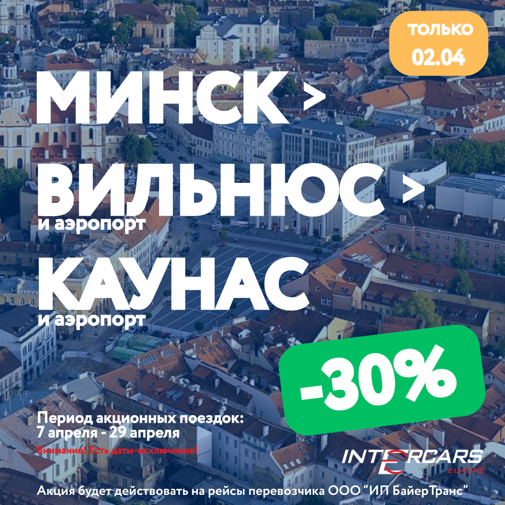 Летите через Вильнюс или Каунас? Или давно планировали поездку в Литву? Только 02.04 с 11:00 до 23:59 по промокоду «ЛИТВА» дарим скидку 30% на автобусные билеты по маршруту Минск ↔ Вильнюс ↔ Каунас (и аэропорты) и обратно.