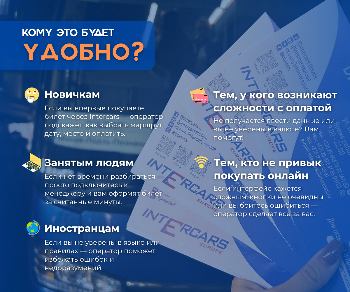 Теперь на сайте и в мобильном приложении Intercars вы можете оформить билет напрямую с помощью менеджера. Это удобно, быстро и абсолютно бесплатно — вы платите только за сам билет.
