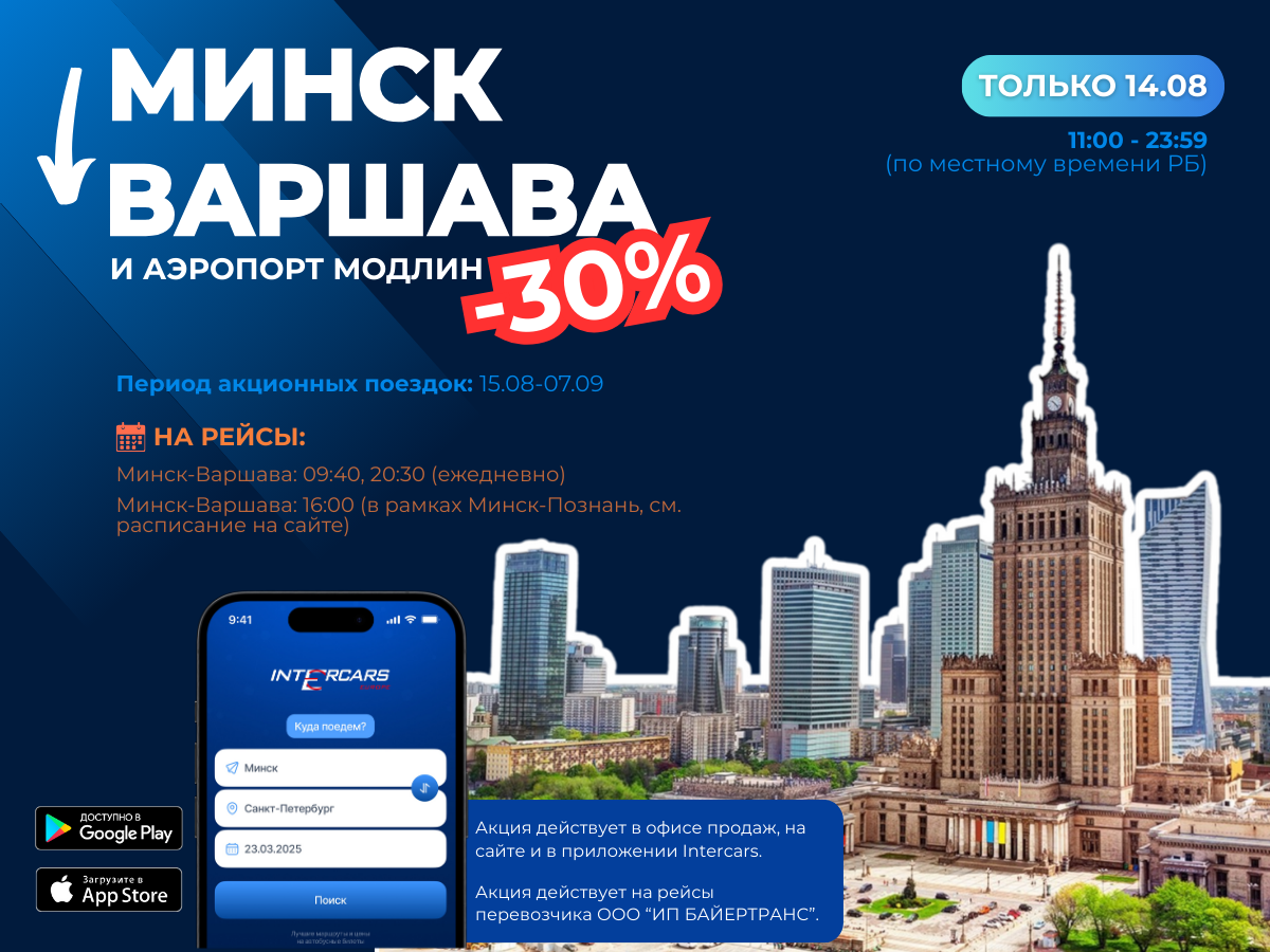 Только 14 августа с 11:00 до 23:59 по местному времени РБ — ловите скидку -30% на билеты в Варшаву💙
