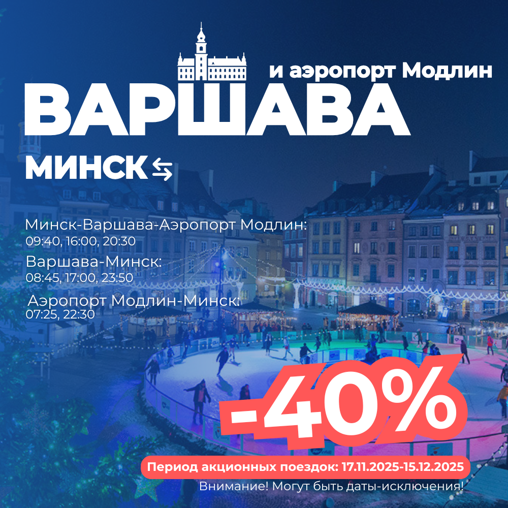 Только 13 ноября с 11:00 до 23:59 по местному времени РБ — ловите скидку -40% на билеты в Варшаву 💙